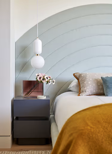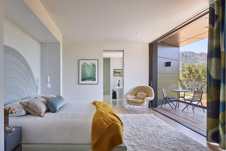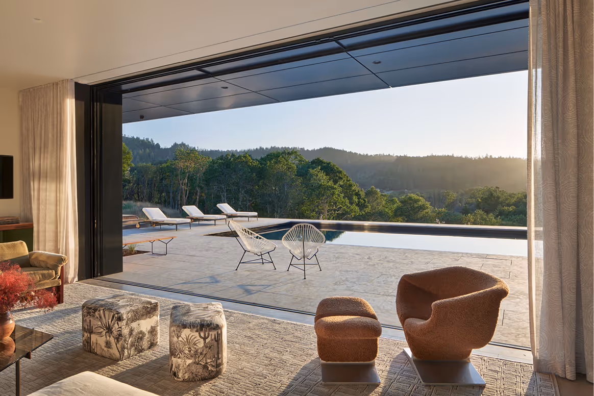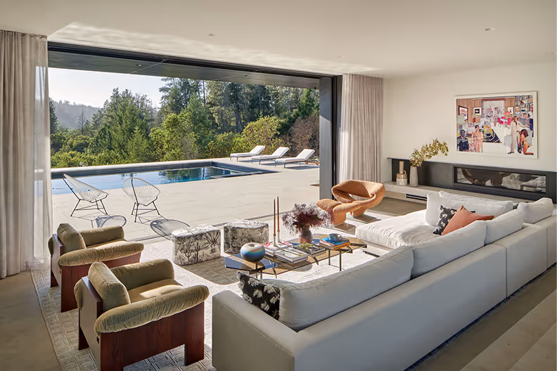 The living room serves as the heart of the home, featuring grand sliding doors that open to sweeping hillside views. A curated mix of the client’s contemporary art collection and designer furniture adds a sophisticated feel.