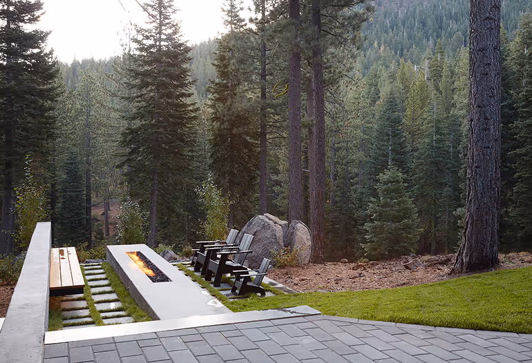 Outside, multiple fire pits and cozy lounge areas invite you to unwind and enjoy the peaceful forest setting, day or night.