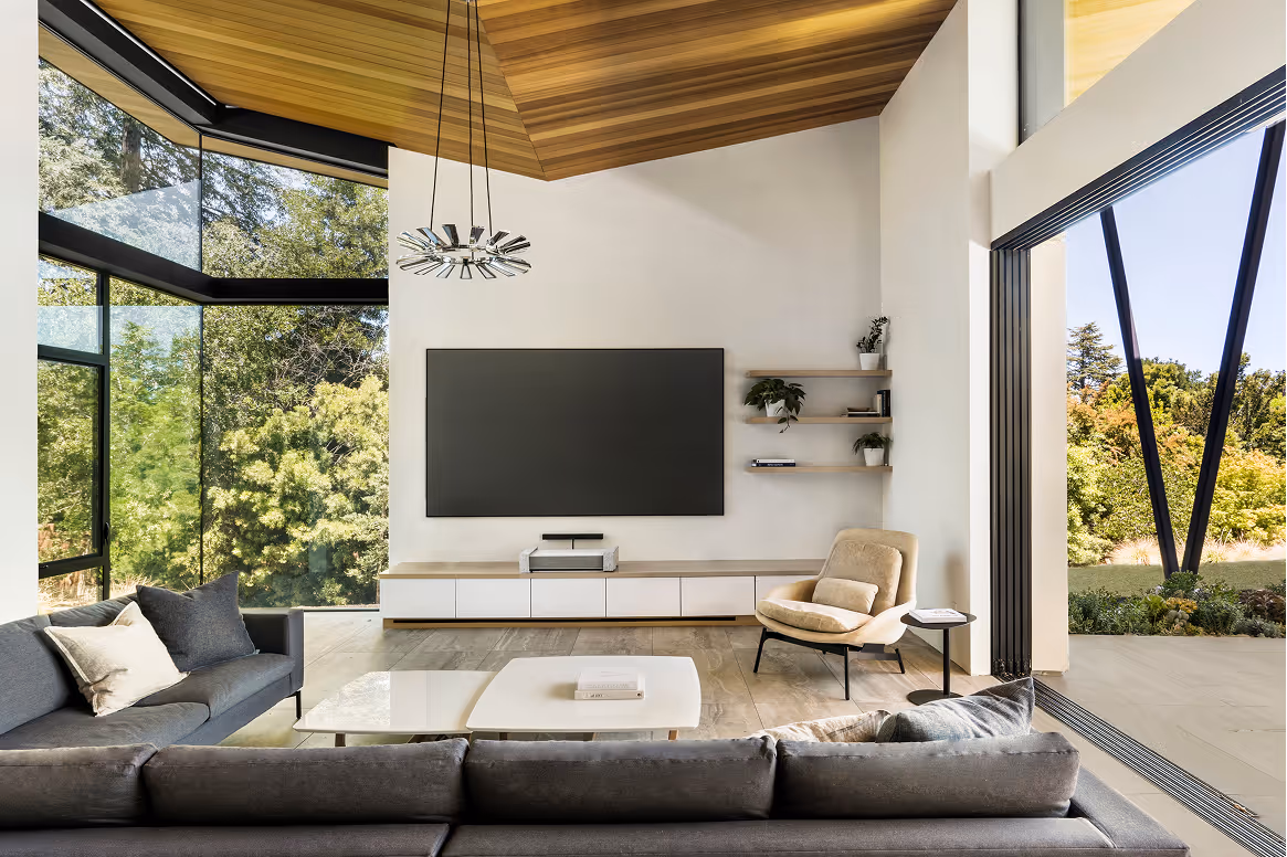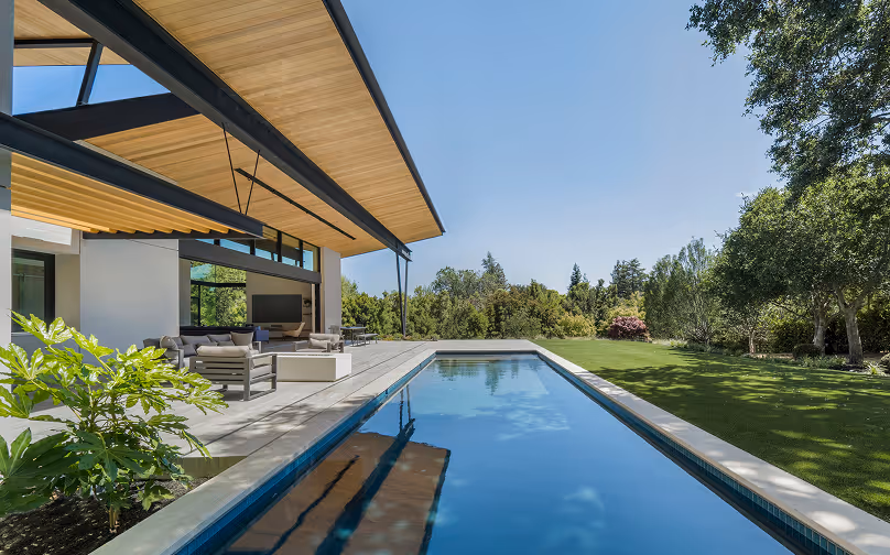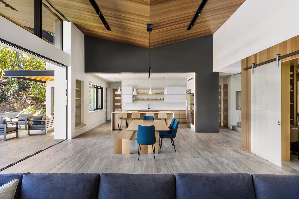 The Peninsula Custom is a complex 5 bedroom, 5 bathroom custom construction built in the beautiful Los Altos Hills of California. Though it is just a short five minute drive from downtownLos Altos, its placement in the mature trees and surrounding hills allows it to maintain a remote and private feel. The home, designed by Studio S Squared, consists of a majority of prefabricated units, with a large site-built great room with a vaulted ceiling that opens up to the backyard pool and lounge area.
