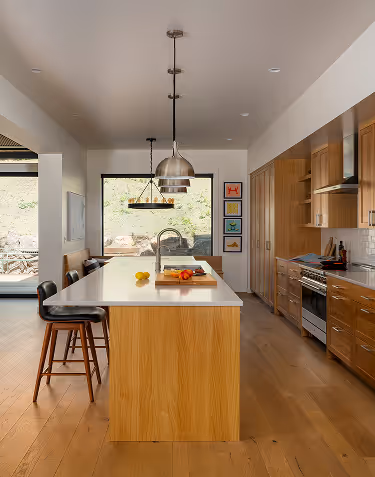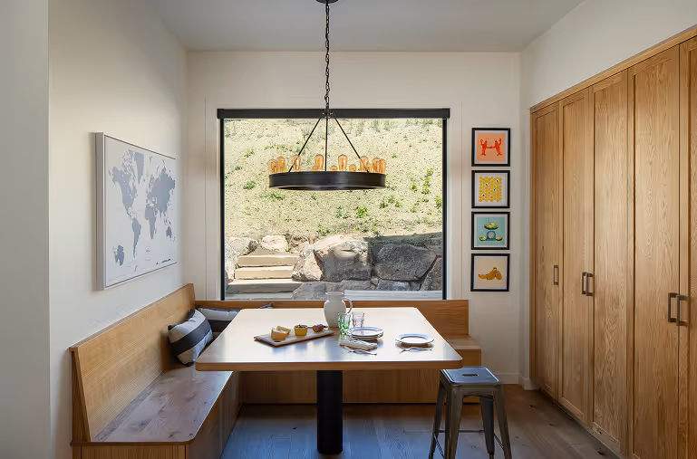 The spacious open living area with kitchen, living, and dining area all connected makes the perfect environment for entertaining. The wooden paneled ceiling, large surrounding windows, and cozy fireplace work to further elevate the space and strike a balance between the home’s natural and modern aesthetics.