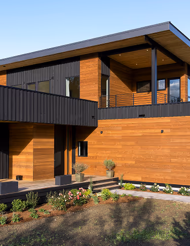 Overhead, a broad cantilevered roof offers shade and shelter—and up top, a second-floor thermally modified deck includes a sauna and hot tub, making it easy to relax and take in the views.
